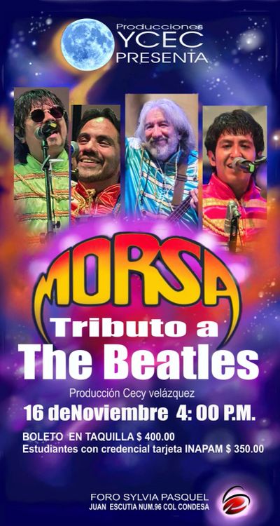 Sinopsis: Sumérgete en la música icónica de los Beatles con Grupo Morsa, una de las bandas tributo más destacadas de México y Latinoamérica. Con más de 38 años de experiencia, Grupo Morsa ofrece una experiencia única y emocionante, interpretando los grandes éxitos de los Beatles, desde "I Want to Hold Your Hand" hasta "Hey Jude", "Yesterday" y muchos más.